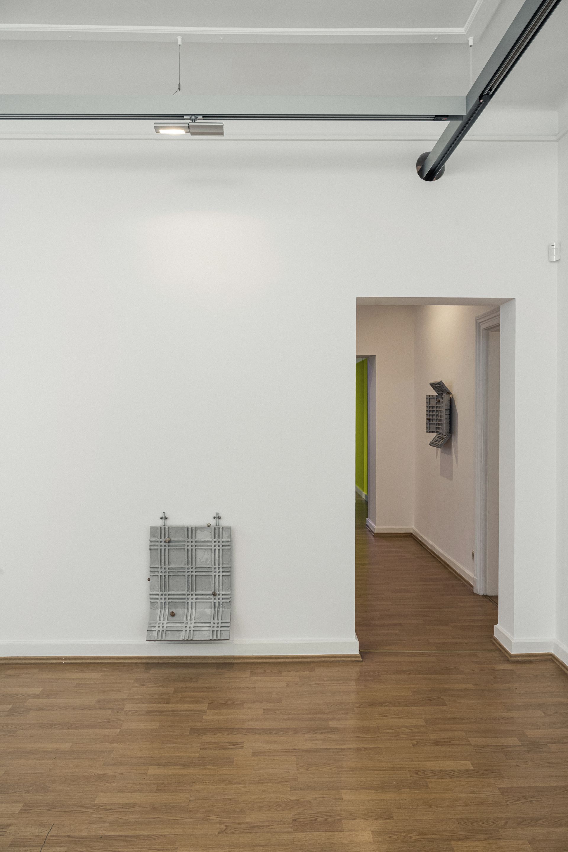 The works are created through a labour-intensive process involving sculpted polystyrene brushed with layers of acrylic resin and silicone to produce negative mold-like forms of the original relief patterns. Messy and meticulous, Schumacher’s technique further involves gouging these intermediary layers away to leave a fragile final layer with a varying thickness whose eggshell-thin texture creates a playful topography. The resulting inverse spatial reliefs are ultimately imperfect and unpredictable; dynamic combinations of both decomposition and design. This gives a poetic ambivalence to the diamond patterned reliefs, qualifying the references, for example, to window grates, protective ironwork and tartan-like motifs as structures that question the capitalist-driven estrangement between public and private space. For the abstract brutalist form, the rough texture emphasizes relations to post-war non-objective sculpture and large-scale public art while evoking the complex history of the urban public sphere, which is today under fire.